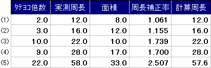 【複合形状】 周長補正率=(タテヨコ倍数×1.05×2+2)/(4×√(タテヨコ倍数×1.05)) ・・・ 倍数補正+5%