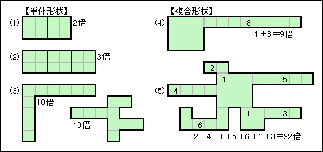 - 複合形状でのタテヨコ倍数は、 形状別の倍数の合計 となる。