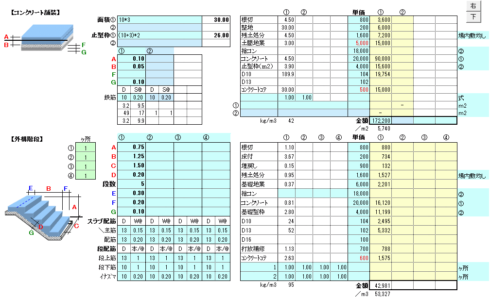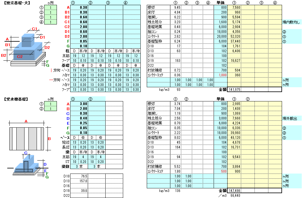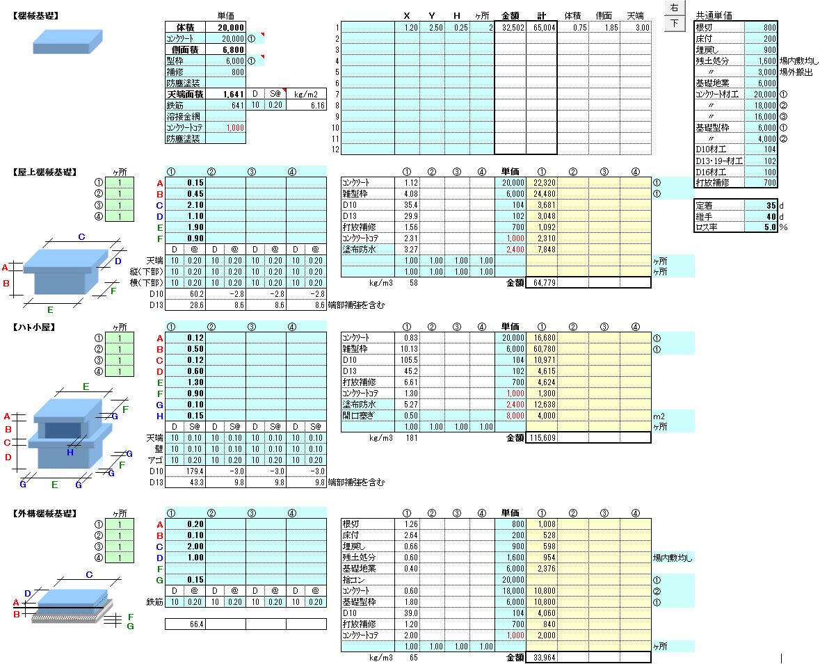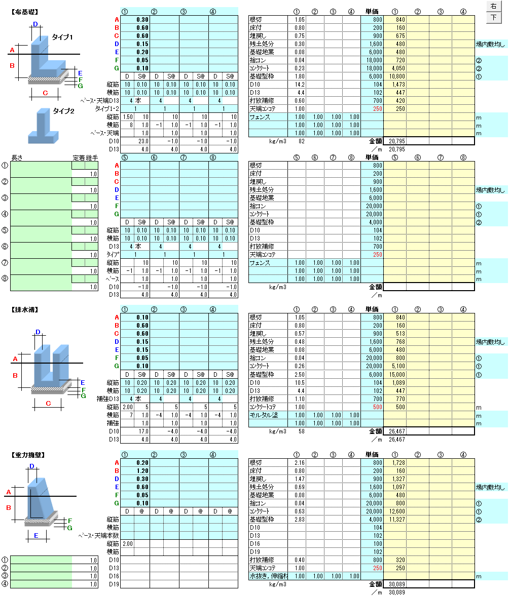 | 10.基礎明細シート | 布基礎, 排水溝, 重力擁壁, ピット・受水槽基礎, 独立基礎, コン舗装, 外構階段 |