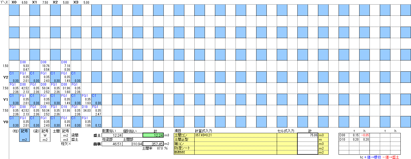 | 2. | 「土間計測」 | 面積計算表。(スパン面積−基礎−梁) |