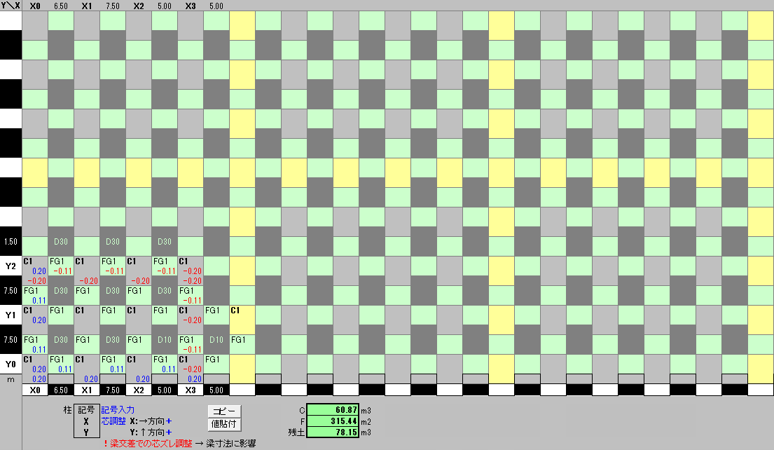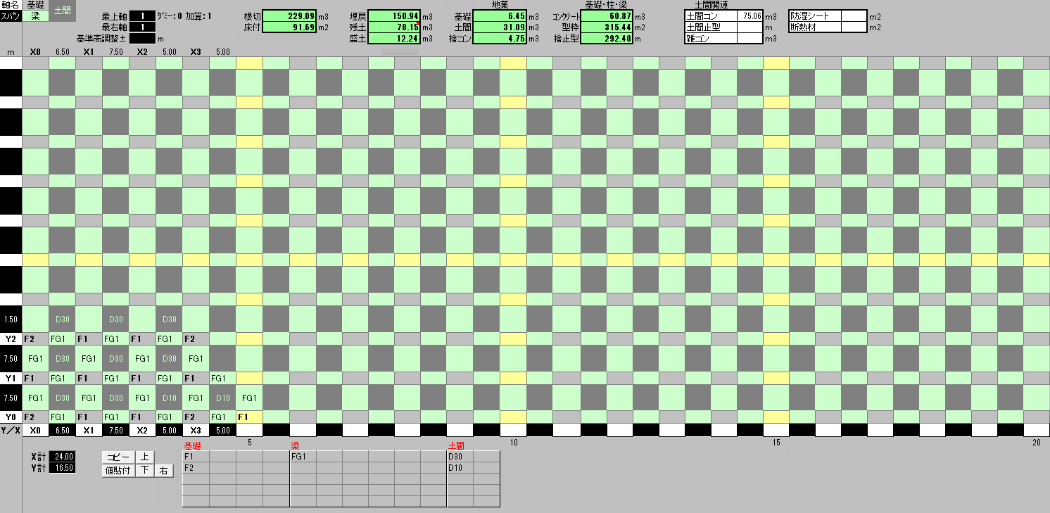 | 2.配置・集計 | 軸設定(通りとスパン), 基礎,梁,土間の配置。 配置同時集計。 |