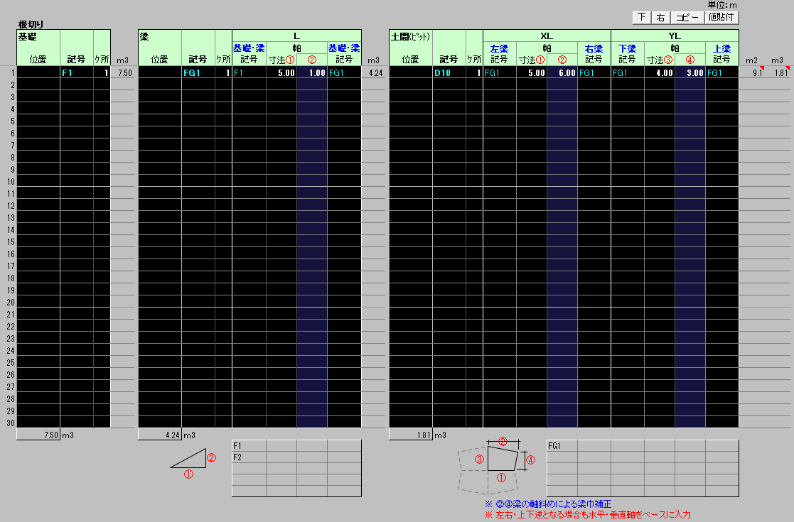 | 6. | 「梁交差」 | 梁交差部のコンクリート,型枠,残土を計測。 柱交差部の減仕口面積を計測(1.0m2超えのみ)。 |
