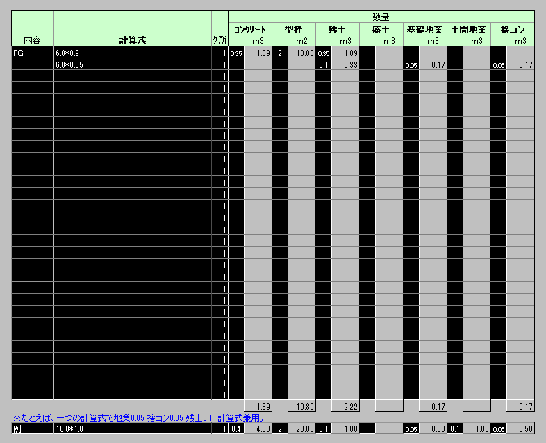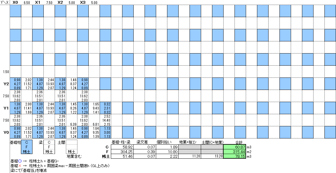 | 9. | 「地業」 | 1.基礎・梁の地業面積(床付け面積)を集計、×tにて体積計算。 2.土間地業体積の集計。 3.基礎・梁の捨コン、止め型枠集計。 |